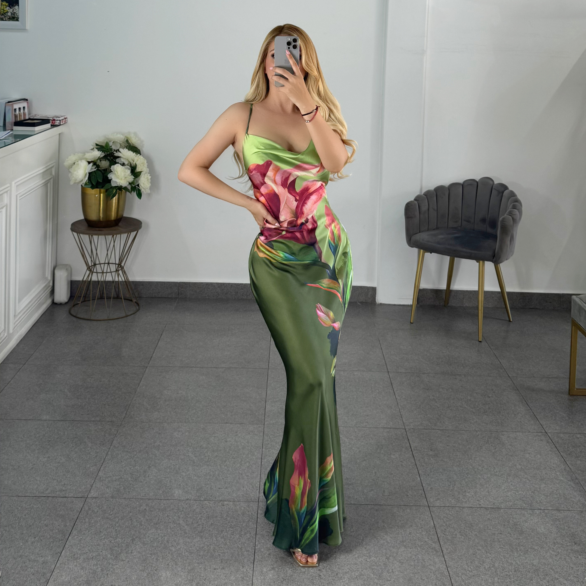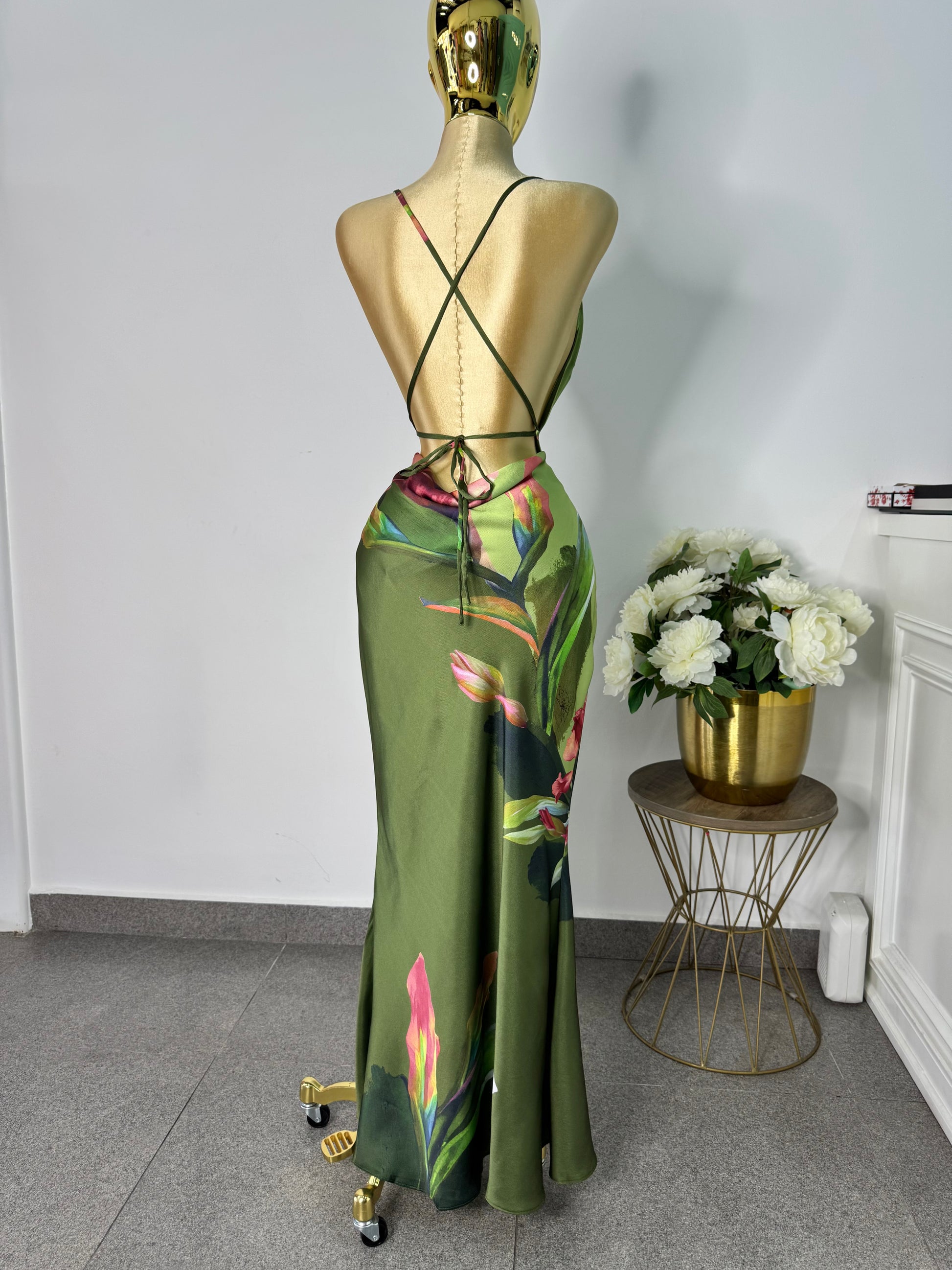 Vestido verde satin estampado
