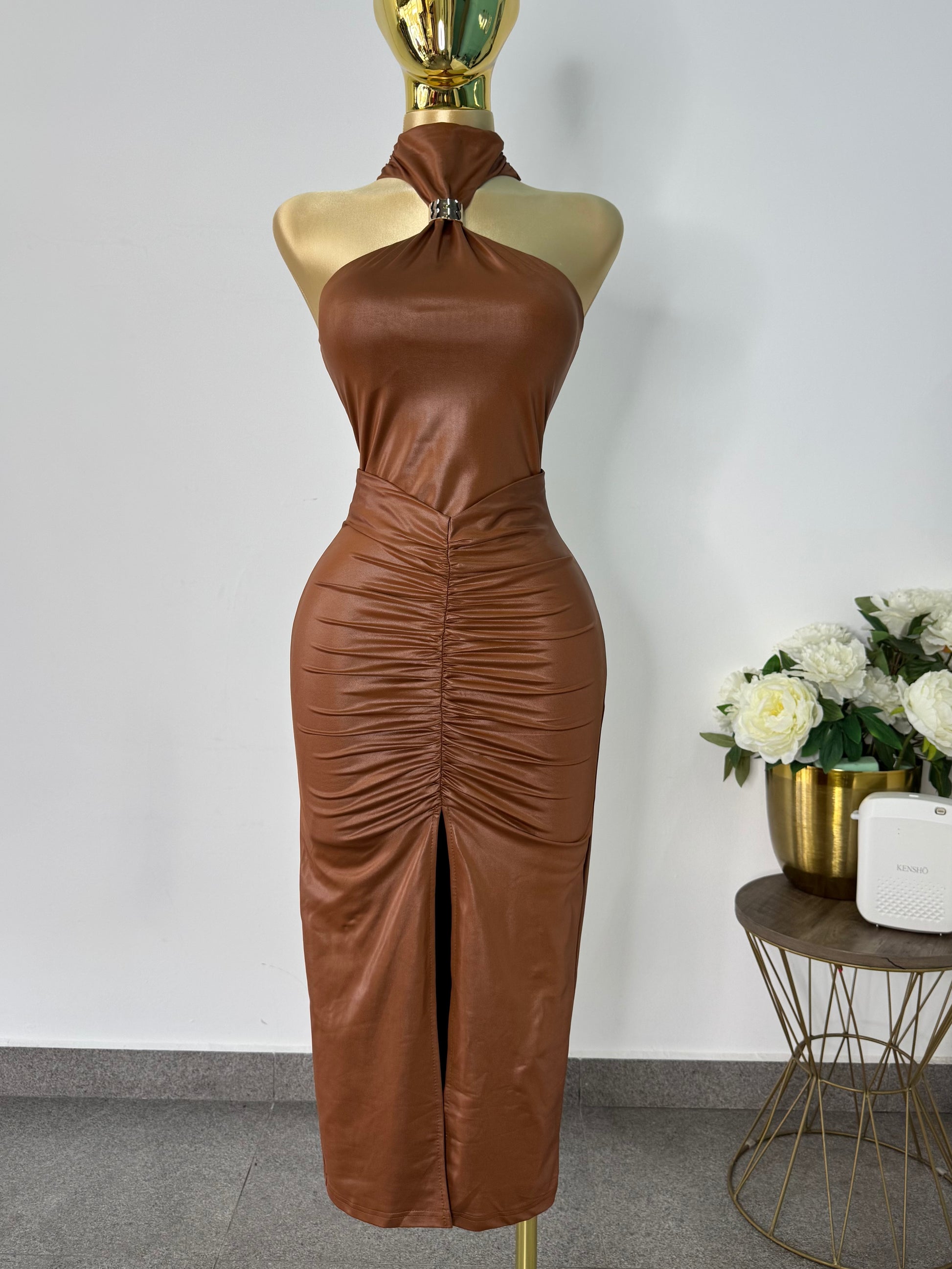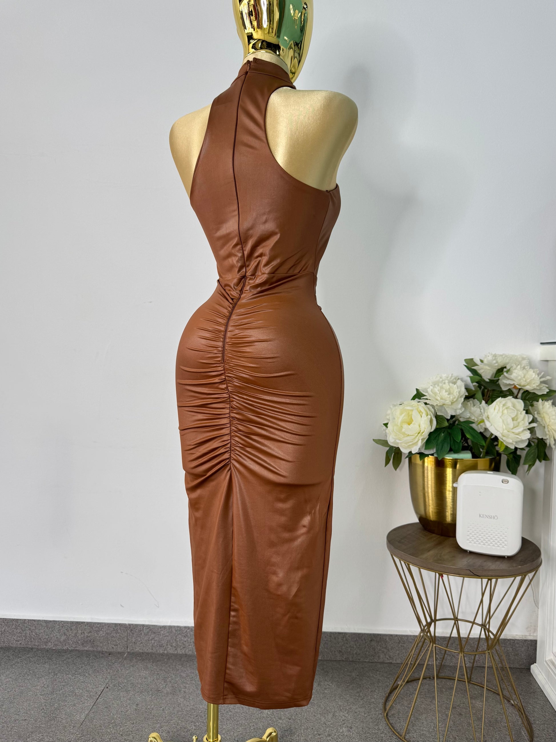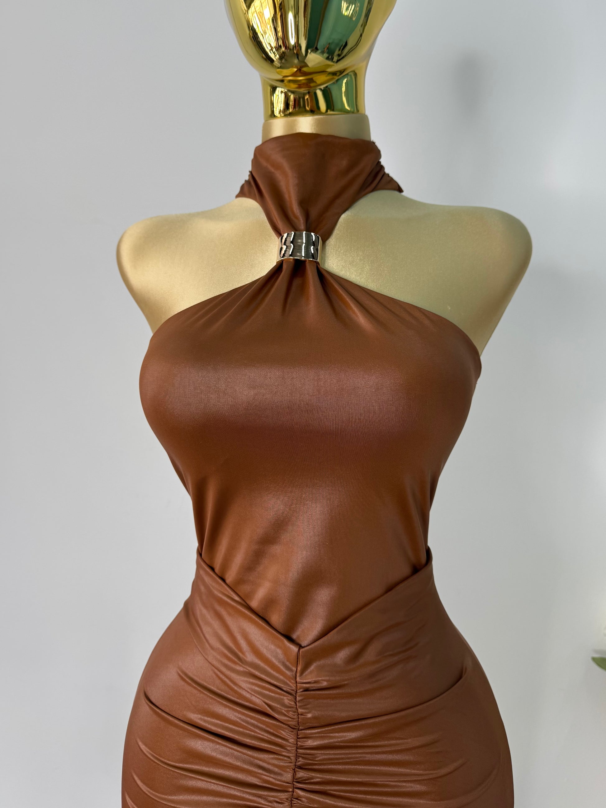 Vestido mini piel cafe con detalle dorado