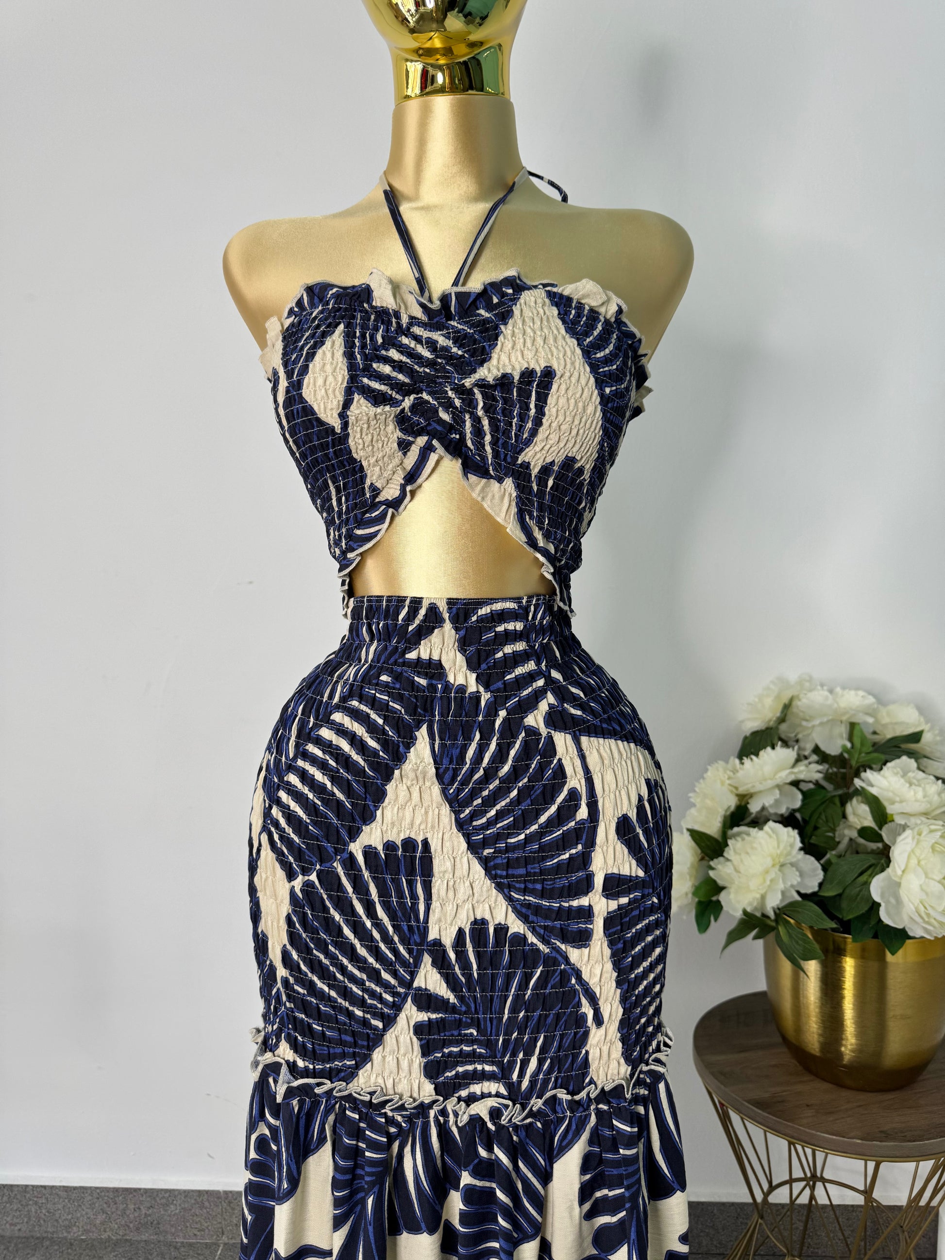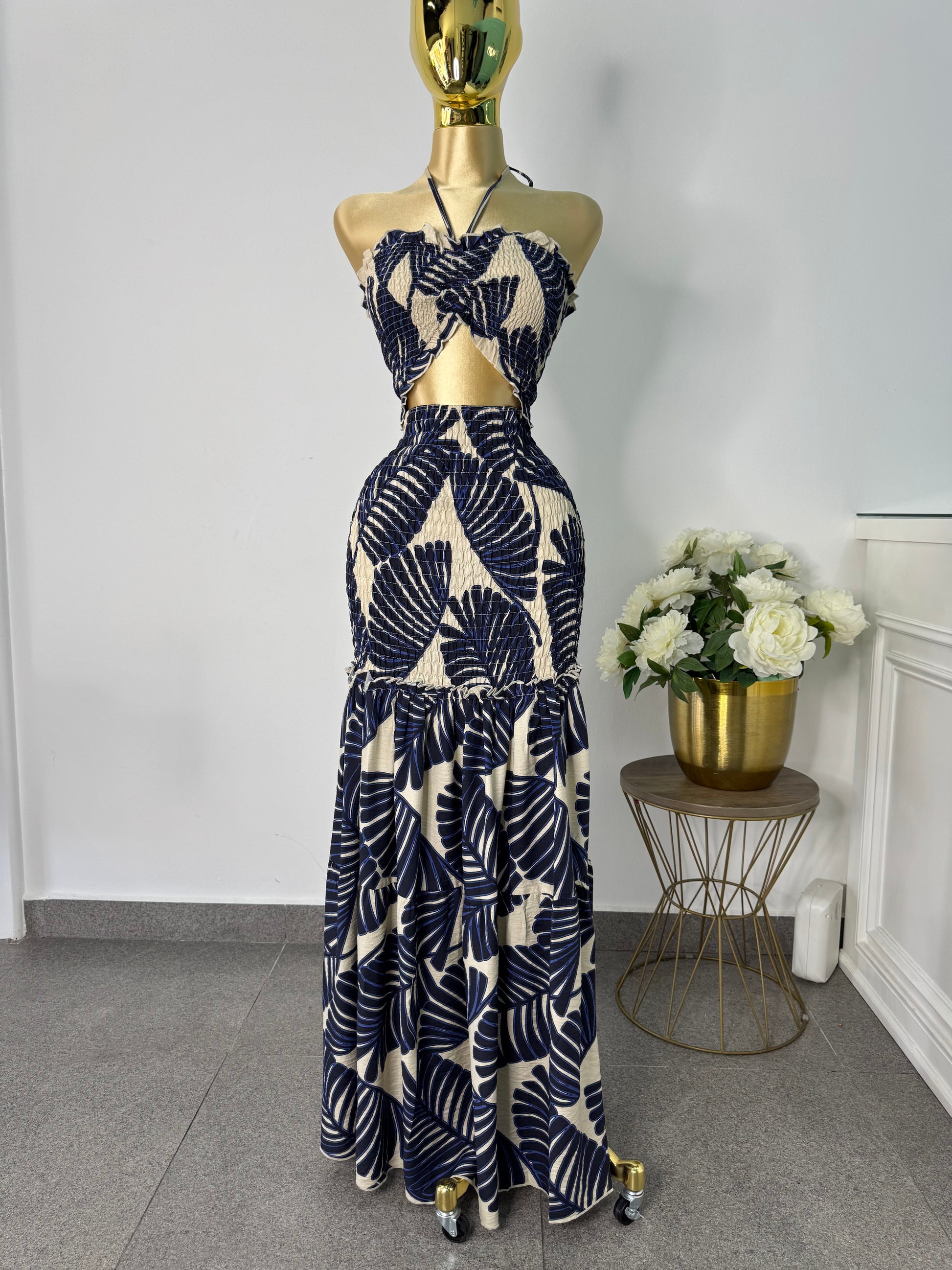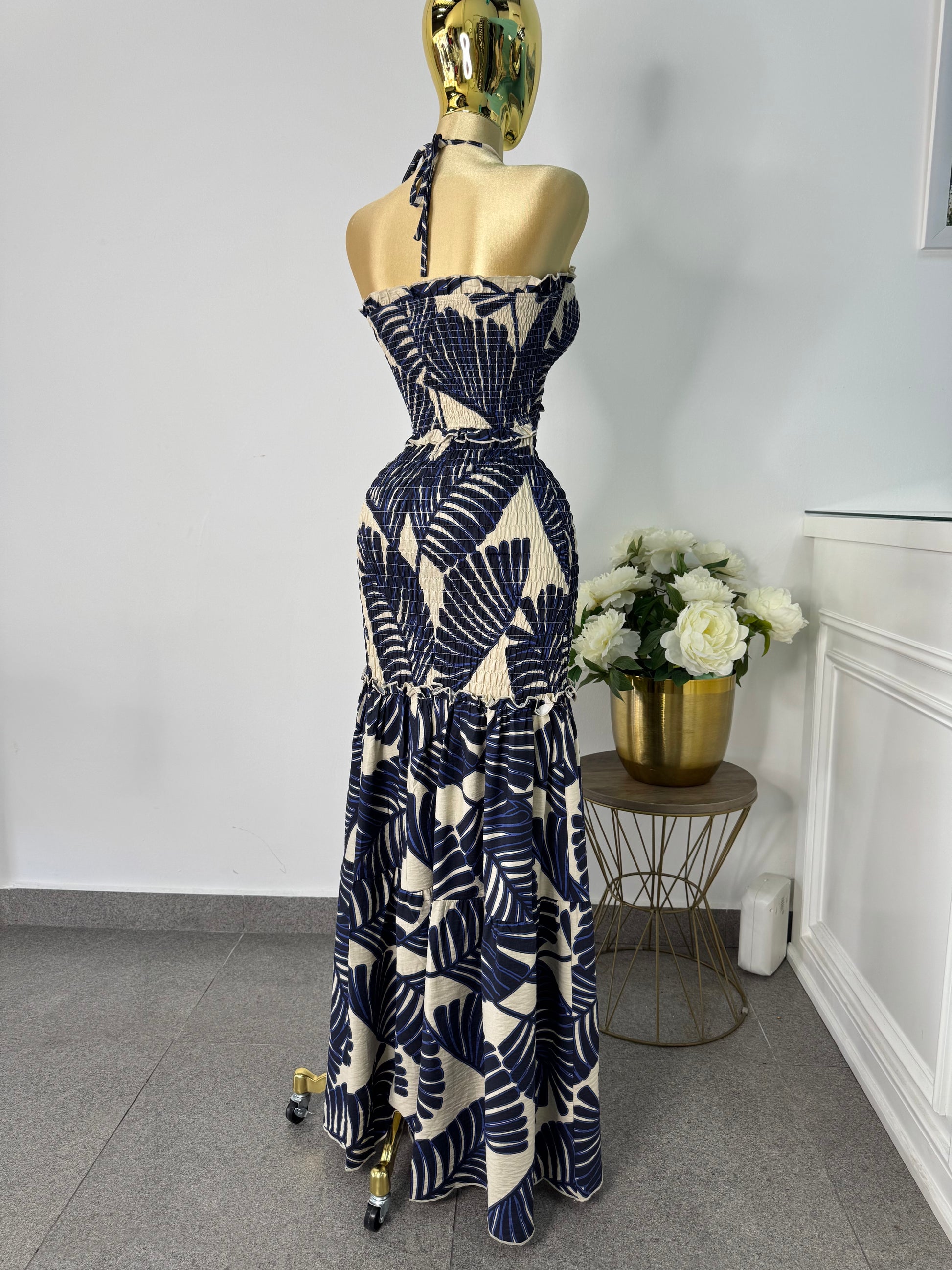 Vestido azul marino con beige
